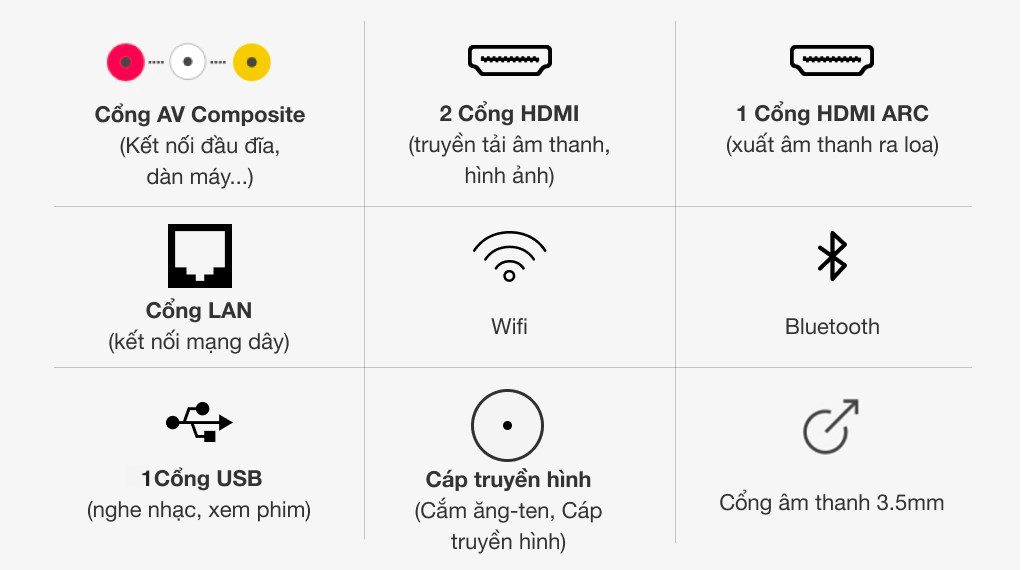 | Cổng nhận hình ảnh, âm thanh | 3 cổng HDMI có 1 cổng HDMI ARC, 1 cổng Composite |