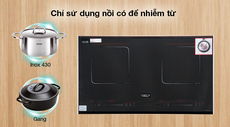 - Bếp sử dụng nồi/chảo có đáy từ (inox 430/gang) dạng đáy liền. Không sử dụng nồi, chảo có đáy rỗ tổ ong để tránh thất thoát nhiệt và hư hỏng sản phẩm.