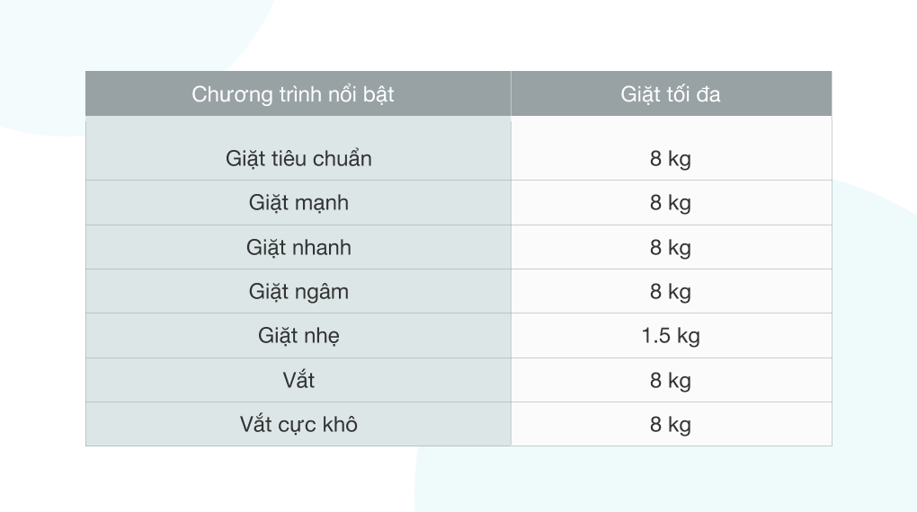 | Chương trình giặt | Giặt mạnh|Giặt ngâm|Giặt nhanh|Giặt nhẹ|Giặt tiêu chuẩn|Vắt|Vắt cực khô |