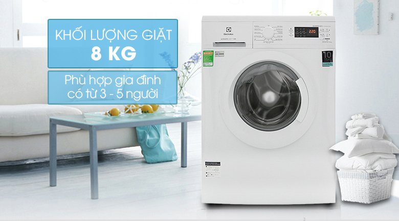 Với khối lượng giặt 8 kg, chiếc máy giặt cửa trước này dễ dàng đáp ứng nhu cầu giặt giũ cho gia đình có từ 3 - 5 thành viên.