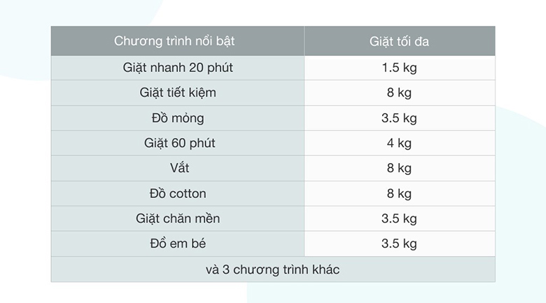 Máy giặt có 8 chương trình giặt nổi bật và 3 chương trình giặt khác tiện lợi cho người dùng bao gồm: giặt nhanh 20 phút, giặt tiết kiệm, đồ mỏng, giặt 60 phút, vắt, đồ cotton, giặt chăn mền, đồ em bé,...(Xem chi tiết tại bảng thông số kỹ thuật). Đồng thời chế độ giặt nhanh 20 phút còn giúp bạn tiết kiệm thời gian giặt đồ trong những trường hợp bận rộn.