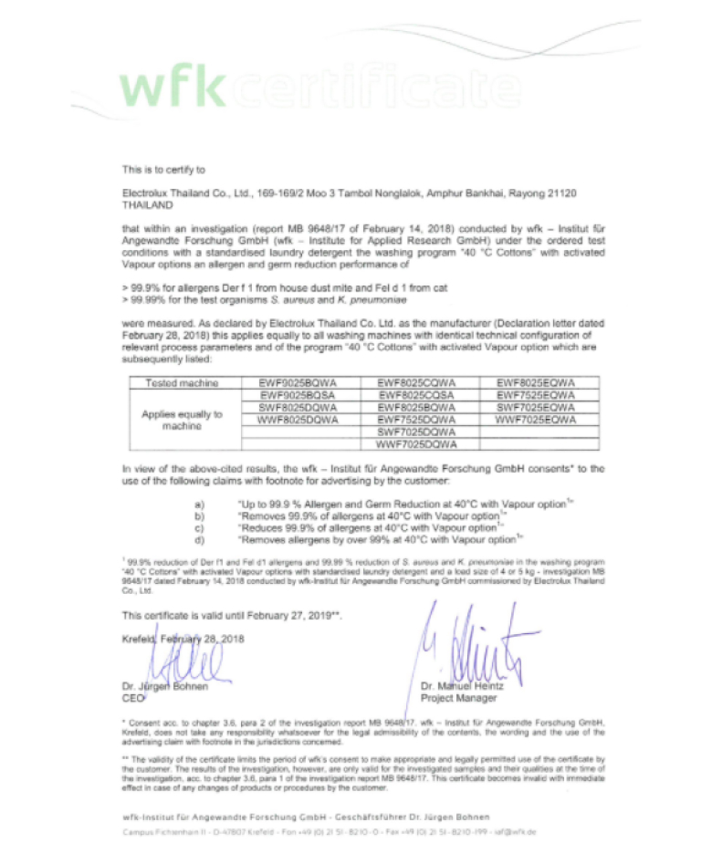 Công nghệ giặt hơi nước Vapour Care trên máy giặt Electrolux được WFK công nhận có thể giúp diệt khuẩn, ngừa dị ứng đến 99,9%.