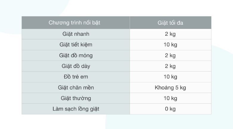 | Khối lượng giặt | 10 Kg |