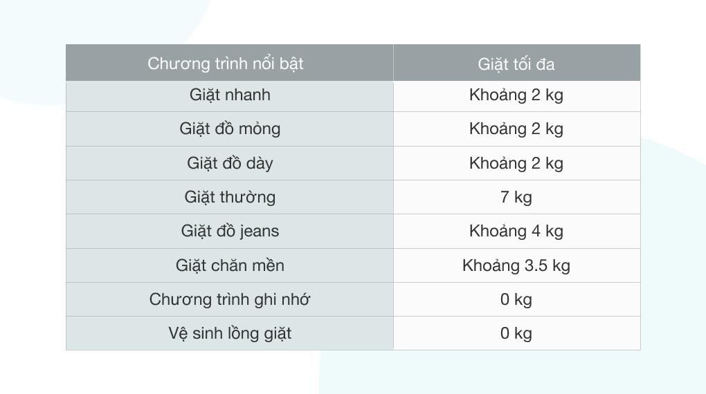 | Chương trình giặt | Chăn mền|Ghi nhớ chương trình giặt|Giặt nhanh|Giặt thường|Vệ sinh lồng giặt|Đồ dày|Đồ Jeans|Đồ mỏng |