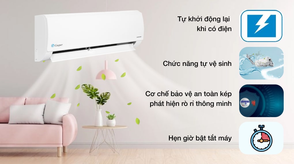 - Tự khởi động lại khi có điện cho phép máy lạnh Casper Inverter này tự động vận hành lại khi nguồn điện được phục hồi.