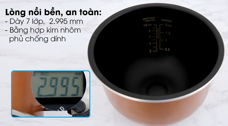 Lòng nồi dày 2.995 mm, có 7 lớp bằng hợp kim nhôm phủ chống dính an toàn cho sức khỏe