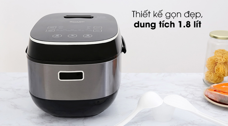 Nồi cơm điện Sharp thiết kế gọn đẹp, màu đen lịch lãm, dung tích 1.8 lít phục vụ tốt cho các gia đình có từ 4 - 6 thành viên