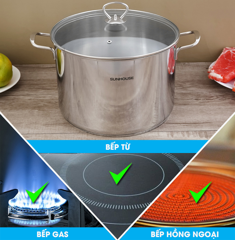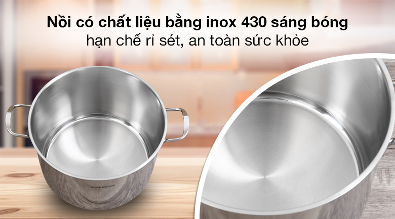 Nồi inox Sunhouse chất liệu inox 430 bền bỉ, chống rỉ sét, không tiết độc tố vào thức ăn khi chế biến, an toàn sức khỏe