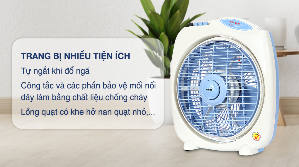 | Tiện ích | Công tắc và các phần bảo vệ mối nối dây làm bằng chất liệu chống cháy|Lồng quạt có khe hở nan quạt nhỏ|Tự ngắt khi đổ ngã |
