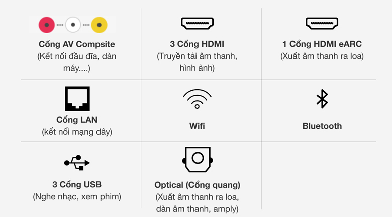 | Cổng nhận hình ảnh, âm thanh | 4 cổng HDMI có 1 cổng HDMI eARC (ARC), 1 cổng Composite |