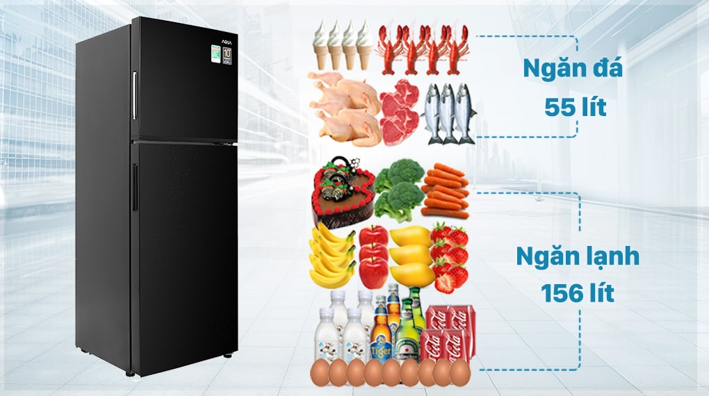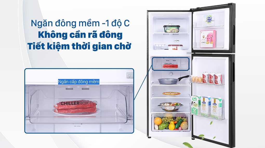 Ngoài ra, tủ lạnh trên thuộc loại tủ thiết kế ngăn đá trên hai cửa, dung tích 211 lít phù hợp với các gia đình từ 2 đến 3 người.